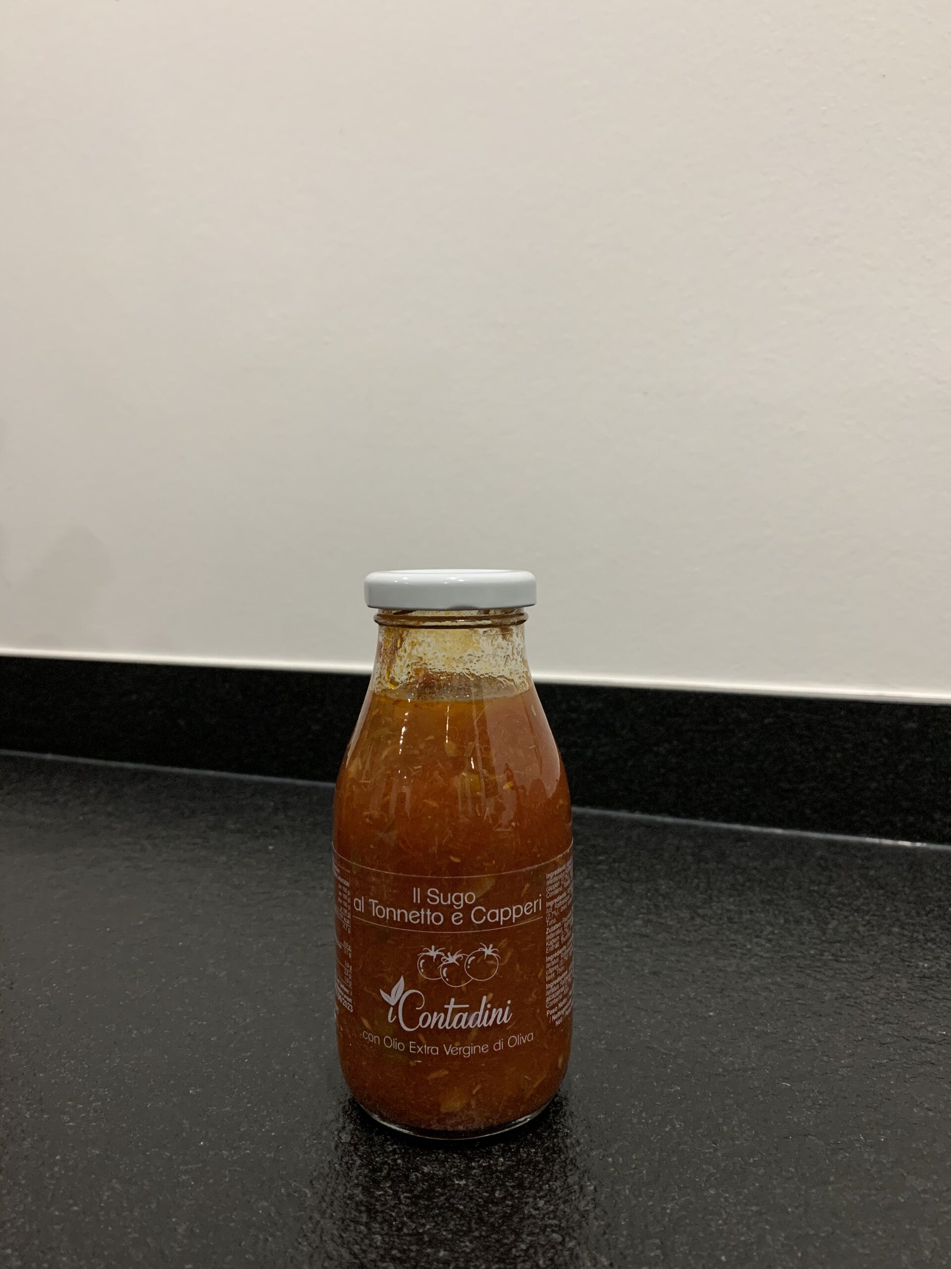 Kant en klare tomatensaus met tonijn en kappertjes.